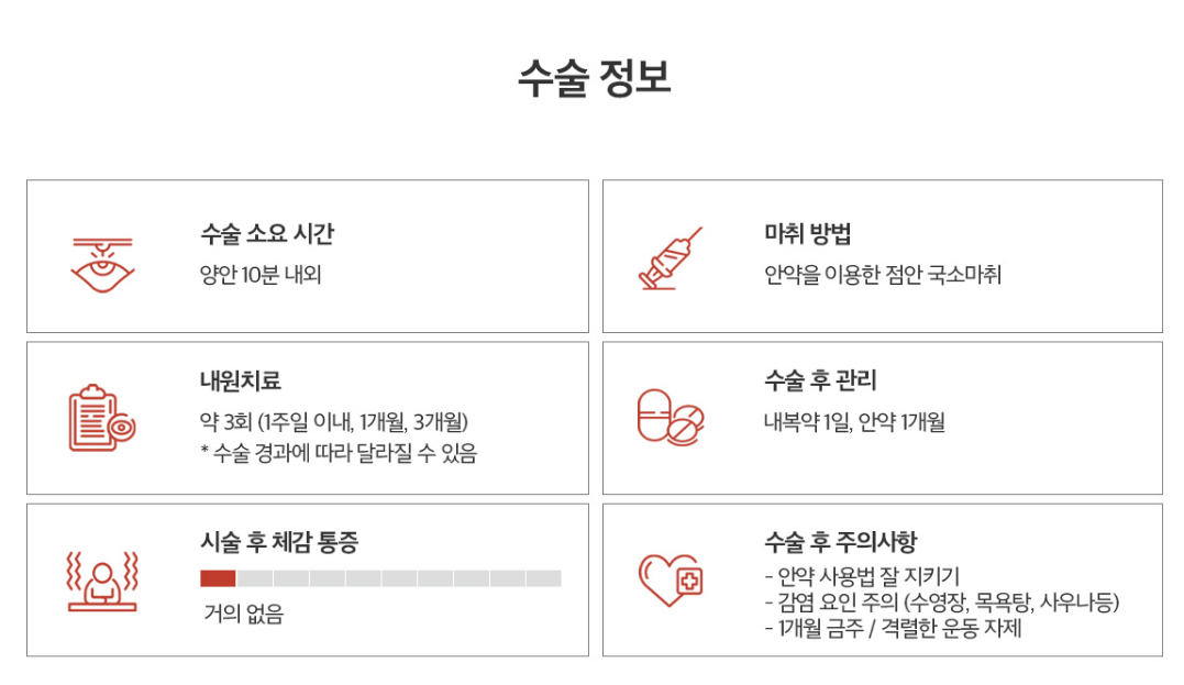 - 수술 후 초기에는 눈 비비지 않기, 물/사우나/수영은 의사 지시까지 제한.